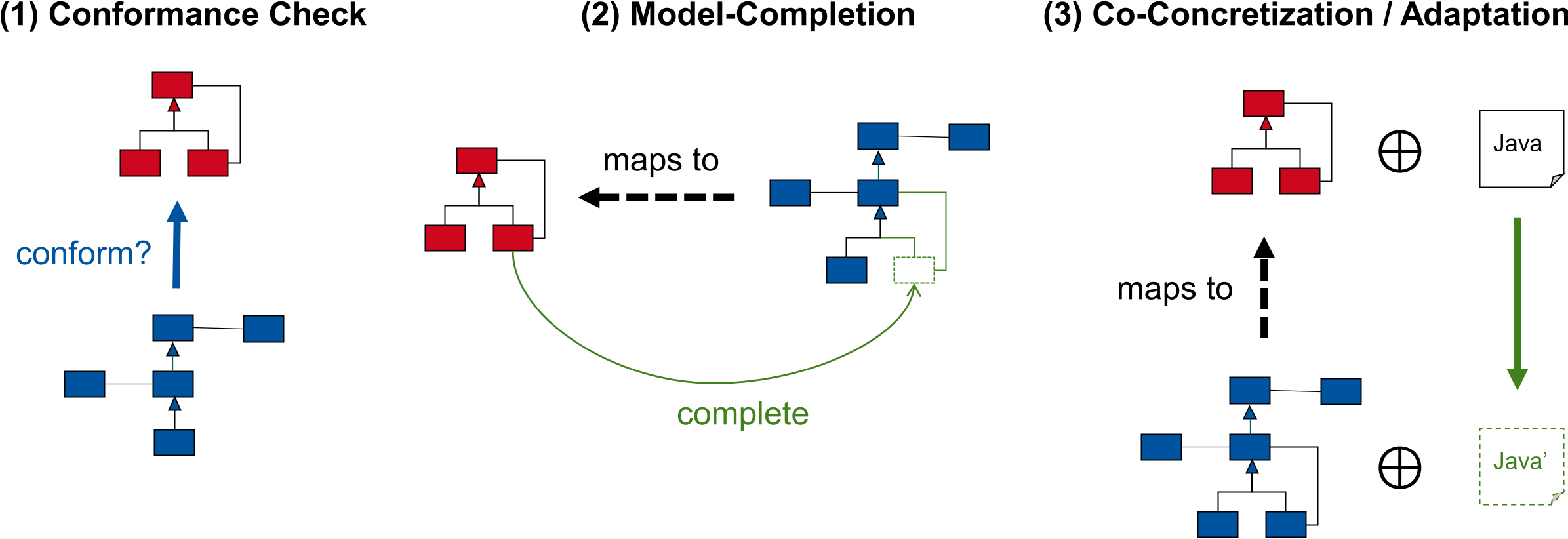 Ziel der Masterarbeit ist es, das Tooling zur Adaptierung oder “Co-Konkretisierung” von Referenzimplementierungen in dem JavaDSL-Projekt auszubauen. Die “Co-Konkretisierung” soll entlang der Beziehung eines Referenzklassendiagramms, welches z.B. ein Entwurfsmuster spezifiziert, zu einem konformen Modell des konkreten Szenarios durchgeführt werden. Diese Beziehung wird durch Inkarnationsmappings über Stereotypen im konkreten Modell kodiert. Konkret soll auch die Adaptierung mehrerer Entwurfsmuster sowie mehrfacher Inkarnation der Entwurfsmuster unterstützt werden.